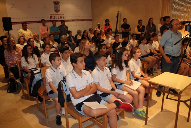 El acto, que se ha celebrado en el salón de plenos del Ayuntamiento de Bullas, ha contado, además de la presencia de los alumnos, la maestra Ana Abril, quien les ayudado a desarrollarlo, la Directora del Colegio Amor de Dios y familiares, con el Director General de Formación Profesional, Sergio López, y la Alcaldesa, María Dolores Muñoz.