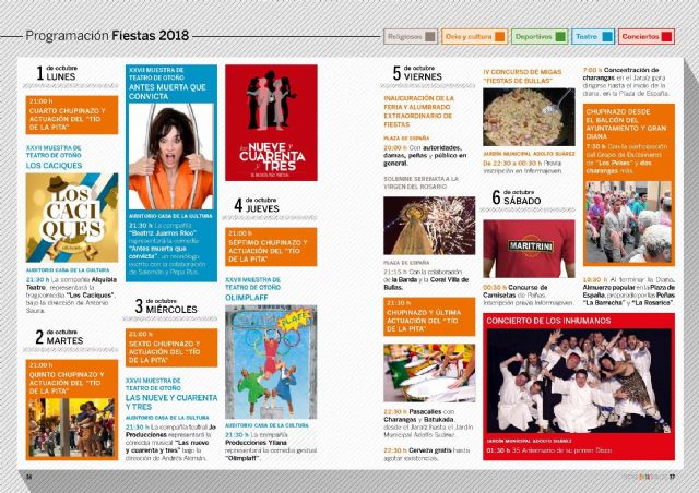 Un programa extenso y muy completo al que hay que añadir más actividades deportivas, culturales, religiosas y la Feria de la Tapa (del 11 al 14 de octubre); que quedan recogidas en la revista de las Fiestas Patronales, elaborada cada año gracias al patrocinio de comercios y establecimientos. Además, toda la programación se podrá consultar en la web www.bullas.es.