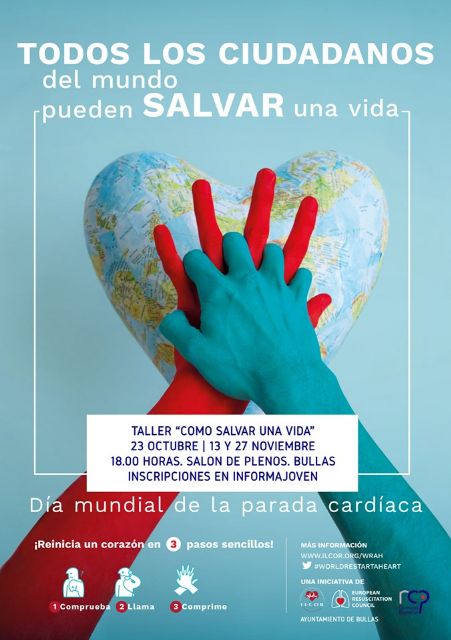 Los días 23 de octubre y 13 y 27 de noviembre se llevarán a cabo en el Salón de Plenos del Ayuntamiento unos talleres prácticos sobre reanimación cardiopulmonar que promueven desde el Ayuntamiento de Bullas a raíz de la celebración del Día Mundial de la Parada Cardíaca.