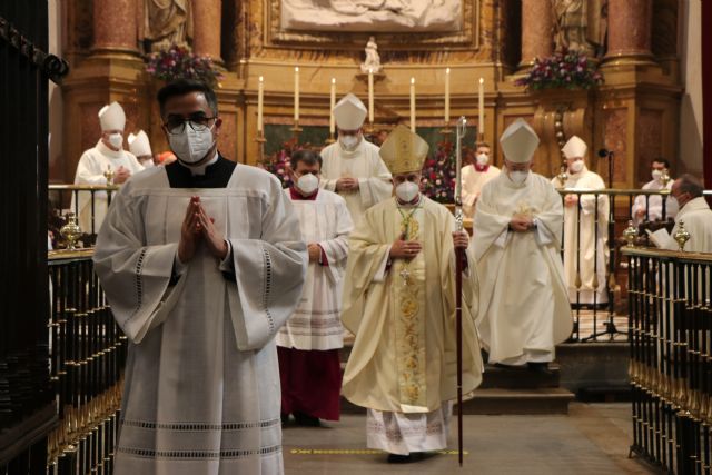 Después de la comunión, el nuevo obispo ha recorrido el templo catedralicio bendiciendo a los fieles, acompañado por el arzobispo emérito de Burgos, Mons. Francisco Gil Hellín, y el obispo auxiliar de Cartagena, Mons. Sebastián Chico Martínez.