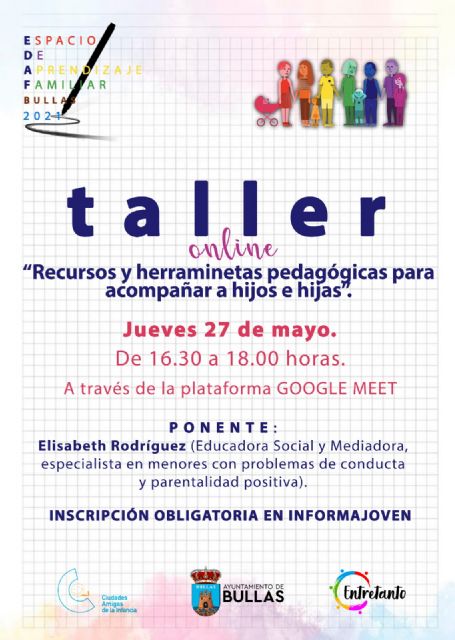 El próximo jueves, 27 de mayo, de 16.30 a 18.00 horas, se impartirá un nuevo taller online en el Espacio de Aprendizaje Familiar, promovido por la Concejalía de Juventud del Ayuntamiento de Bullas con la colaboración de la Asociación Entrentanto.