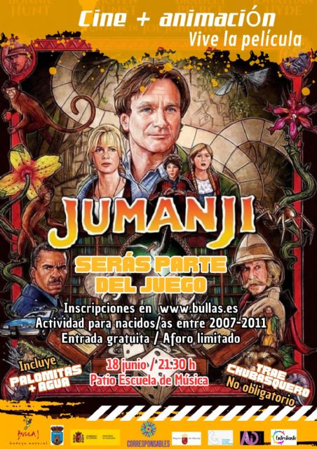 Si naciste entre 2007 y 2011 te proponemos para el domingo 18 de junio a las 21.30 horas ser parte de Jumanji. La Asociación Entretantos realiza esta divertida experiencia en la que proyectará la famosa película de aventuras y animará la proyección haciéndote ser parte del juego.