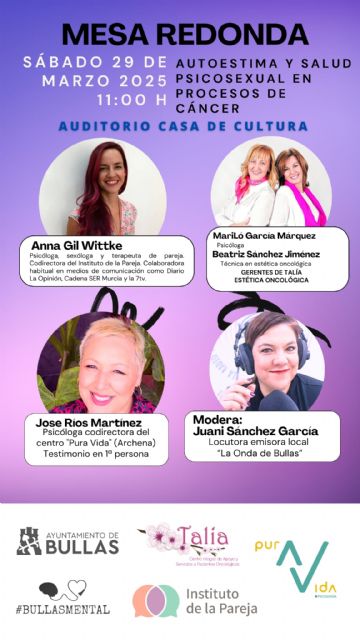 El próximo sábado 29 de marzo, a las 11 de la mañana, tendrá lugar una mesa redonda en la que se abordará la importancia que tiene para la salud mental, la imagen corporal y la autoestima en los procesos de cáncer, y cómo esto influye en la salud psicosexual de las personas afectadas. Esta mesa redonda, programada dentro de las actividades de #BULLASMENTAL, estará moderada por Juani Sánchez, locutora de la Onda de Bullas, y contará con diversas participantes.