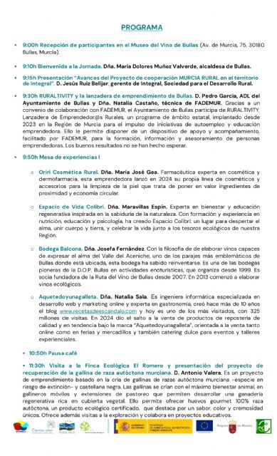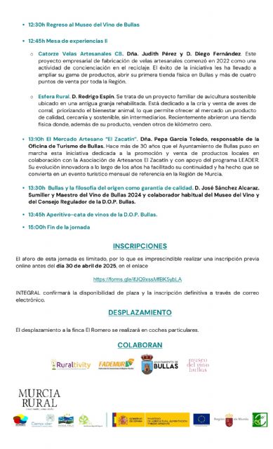 Seguidamente, la primera mesa de experiencias contará con María José Gea de Oriri Cosmética Rural, Maravillas Espín, de Espacio de Vida Colibrí, Josefa Fernández de Bodega Balcona, Natalia Sala de Aquetedoyunagalleta. Tras una pausa, se visitará la finca ecológica El Romero para conocer más sobre el proyecto de recuperación de la gallina de raza autóctona murciana. Y de regreso, en la segunda mesa de experiencias hablarán Judith Pérez y Diego Fernández de Catorze Velas Artesanales y Rodrigo Espín de Esfera Rural. Además, la responsable de turismo del Ayuntamiento de Bullas, Pepa García, profundizará en el mercado artesano 'El Zacatín' y para terminar, José Sánchez, sumiller y Maestro del Vino de Bullas, hablará de Bullas y la filosofía del origen como garantía de calidad.