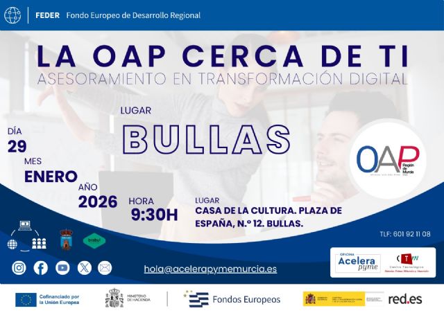 La Oficina Acelera Pyme v.3.0 Región de Murcia continúa su recorrido por el territorio regional con la iniciativa "La OAP cerca de ti. Asesoramiento en transformación digital", que llegará a Bullas el próximo 29 de enero de 2026 con el objetivo de acercar la transformación digital a pymes, autónomos y personas emprendedoras del municipio y su entorno.