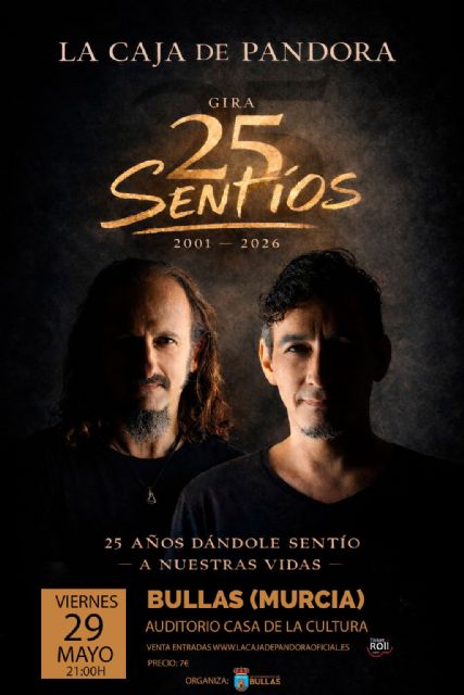 El Ayuntamiento de Bullas ha informado a través de sus redes sociales de que el próximo viernes 29 de mayo, a las 21:00 horas, el Auditorio Casa de la Cultura de Bullas se celebrará un concierto muy especial con motivo de la gira "25 Sentíos (20012026)" del grupo La Caja de Pandora.
