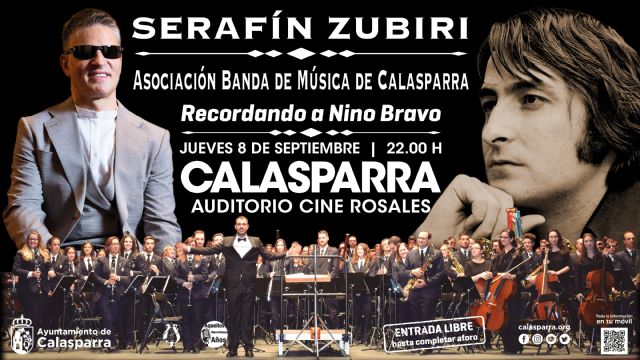 El Ayuntamiento de Calasparra presenta dentro de su programación estival y del ciclo “Aquellos maravillosos años” dedicado a las músicas de otras décadas, el espectáculo 'Recordando a Nino Bravo' con la Asociación Banda de Música de Calasparra junto al cantante y pianista pamplonés Serafín Zubiri en un único concierto en el escenario del legendario Auditorio Cine Rosales el próximo 8 de septiembre con entrada libre hasta completar aforo.