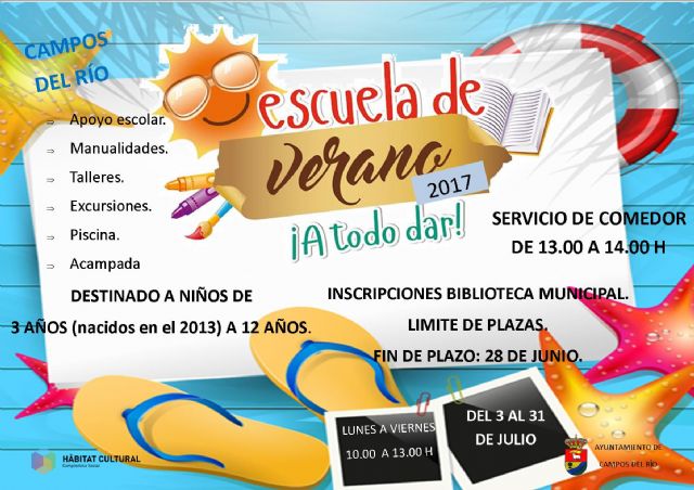 El Ayuntamiento de Campos del Río a través de las concejalías de Educación y Servicios Sociales, han puesto de nuevo en marcha la edición 2017 de la Escuela de Verano del CEIP San Juan Bautista en la que el pasado año participaron 70 niños y niñas con edades comprendidas entre los 3 y los 12 años.