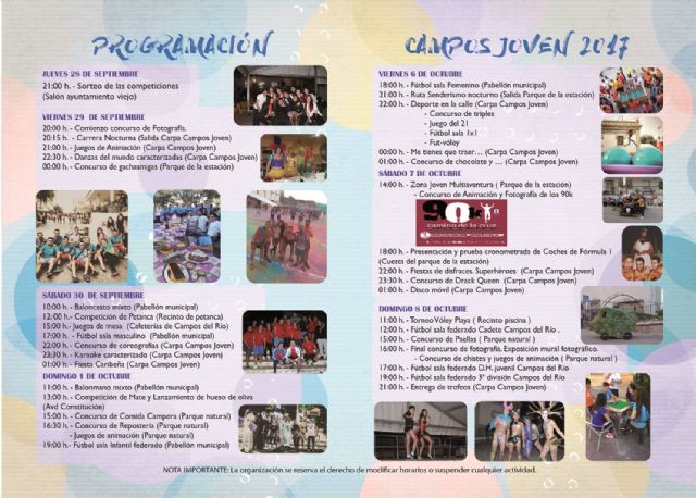 Si la edición de 2016 se caracterizó por un importante aumento de la participación, “este año se han vuelto a superar las cifras de inscripción, algo de lo que nos sentimos especialmente orgullosos y nos anima a innovar y mejorar en esta edición que hoy comienza” afirmaba la alcaldesa de Campos del Río y edil de Juventud, María José Pérez Cerón que recordaba que “este evento intenta promover la participación deportiva de diversos grupos de edad de nuestro municipio en una misma actividad y es por ello por lo que estamos coordinados con la concejalía de Deportes ya que son muchas y variadas las pruebas que nuestras peñas tendrán que superar y que además de deportivas seguimos complementando un año más con pruebas relacionadas con otras materias de interés para nuestra población como las recreativas, lúdicas, culturales e incluso gastronómicas por lo que en este programa colaboran todas las concejalías de nuestro Ayuntamiento”.