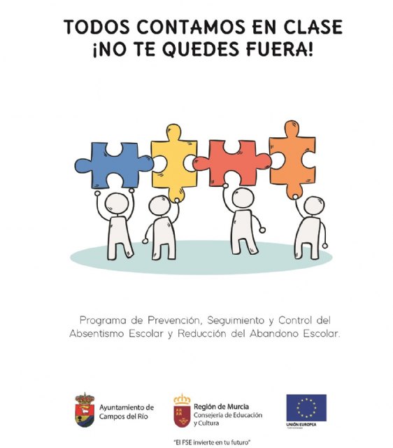 El Ayuntamiento de Campos del Río ha puesto en marcha el Programa de Prevención, Seguimiento y Control del Absentismo Escolar y Reducción del Abandono Escolar durante este curso 2019/2020 subvencionado por la consejería de Educación y Cultura de la Región de Murcia y el Fondo Social Europeo.
