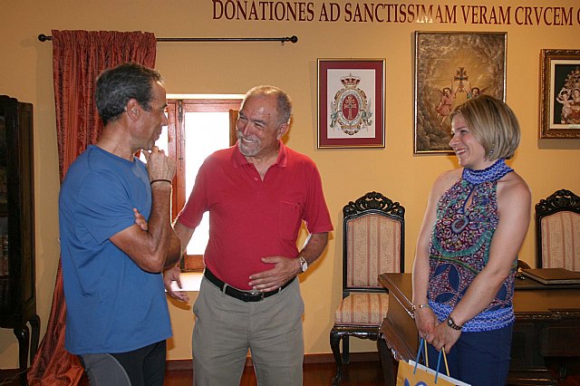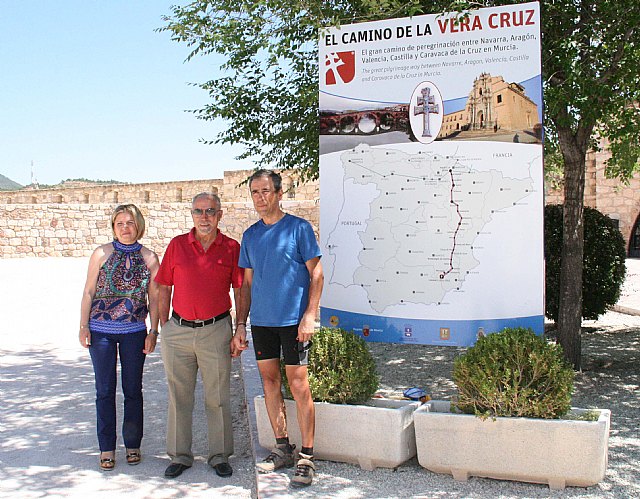 La concejal de Turismo en el Ayuntamiento de Caravaca, Mª Pérez Sánchez, y el teniente de hermano mayor de la Cofradía de la Vera Cruz, Gregorio Sánchez Romero, han recibido esta mañana al yeclano Celso Bañón Ortega, el primer peregrino que oficialmente ha recorrido el trazado completo del “Camino de la Vera Cruz”, recientemente señalizado desde Puente la Reina (Navarra) hasta Caravaca de la Cruz.