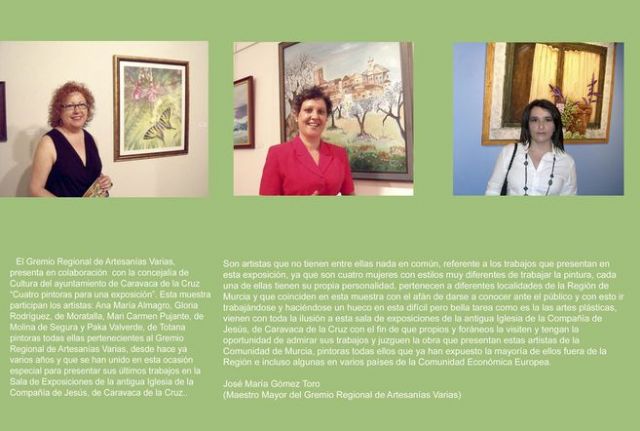 Se trata de cuatro pintoras muy diferentes en cuanto a técnicas y estilos. "Coinciden en esta muestra con el afán de darse a conocer ante el público y con esto ir haciéndose un hueco en esta difícil, pero bella, tarea como es la de las Artes Plásticas. Vienen con toda la ilusión a esta sala de Caravaca con el fin de que propios y extraños la visiten y tengan la oportunidad de admirar sus trabajos y juzguen la obra que presentan estas pintoras, que ya han expuesto fuera de la Región e incluso algunas en varias países de la Unión Europea", destaca el presidente del Maestro Mayor del Gremio Regional de Artesanías Varias, José María Gómez Toro, en el tríptico editado para dar a conocer la exposición.