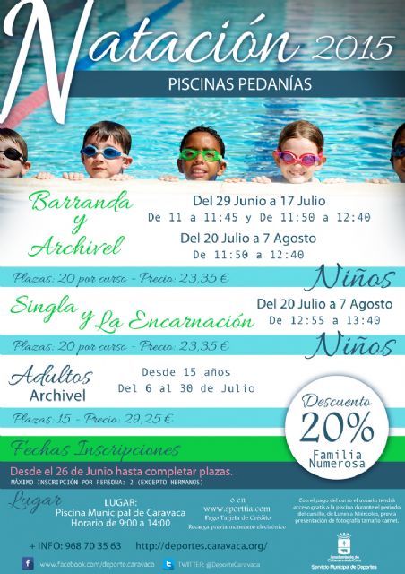 La campaña "Aprende a Nadar" también se va a llevar a cabo en las pedanías de Barranda, Archivel, Singla y La Encarnación. Las inscripciones se pueden formalizar, a partir de mañana, viernes 26 de junio, en las dependencias del Servicio Municipal de Deportes, que durante el verano se encuentran ubicadas en la piscina municipal de Caravaca (carretera de Granada) o a través de la modalidad de matrícula online en la web www.sporttia.com