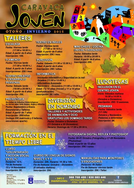 Talleres educativos, ludotecas, actividades de animación para las tardes de los domingos y cursos de formación en el tiempo libre son las tres áreas que componen la programación de ocio alternativo "Caravaca Joven", para los meses de otoño e invierno.