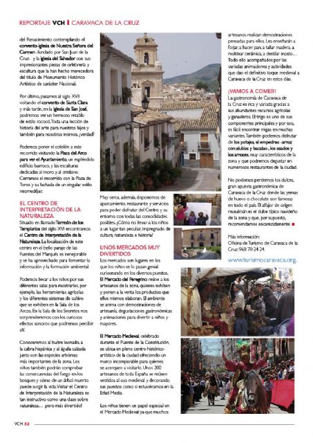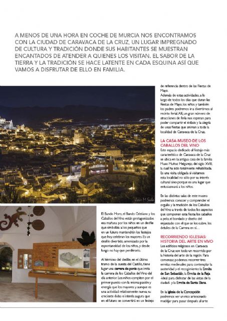 Con el fin de potenciar el perfil de turista familiar durante los meses de primavera y verano, la Concejalía de Turismo del Ayuntamiento de Caravaca de la Cruz ha llevado a cabo varias acciones promocionales en medios escritos. Entre ellas, destacan las inserciones publicitarias y los reportajes publicados en la revista de tirada nacional 'Viajar con hijos', en el anuario 'Turismo Rural con Hijos 2016', en la publicación 'Aladierno' de Air Nostrum y en la guía 'Go!'.