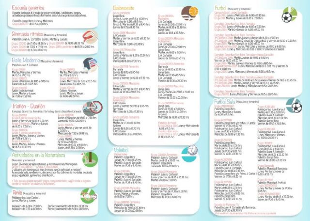 Las fechas establecidas son las siguientes: 8 de septiembre (Actividades en la Naturaleza y Gimnasia Rítmica), 9 de septiembre (Voleibol y Atletismo), 12 de septiembre (Fútbol), 13 de septiembre ((Tenis y Baile Moderno), 14 de septiembre (Baloncesto), 15 de septiembre (Fútbol y Triatlón) y 16 de septiembre (Fútbol Sala). Para el resto de modalidades la inscripción está abierta a partir del lunes 19 de septiembre, de lunes a jueves, de 9.00 a 13.30 y de 17.00 a 20.00, y viernes, de 9.00 a 13.30 horas.