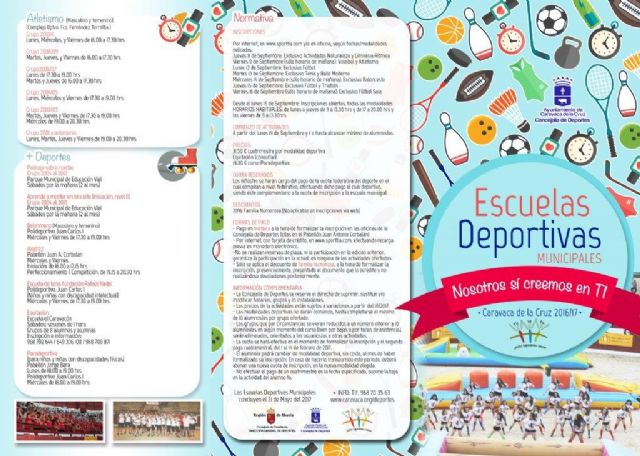Con el lema 'Nosotros confiamos en ti', el Ayuntamiento de Caravaca de la Cruz ha presentado el programa 'Escuelas Deportivas Municipales' para el curso 2016/2017, compuesto por una oferta de dieciocho modalidades, que se impartirán en grupos, en función de categorías de edad o niveles de dificultad.