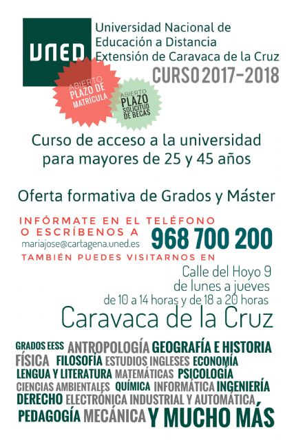 Las personas interesadas en cursar estudios en la Universidad Nacional a Distancia (UNED) pueden formalizar la matrícula para el curso 2017/2018 en la extensión de Caravaca de la Cruz, situada en la calle del Hoyo, número 9. El horario de atención al público es de lunes a jueves, de 10.00 a 14.00 y 18.00 a 20.00 horas.