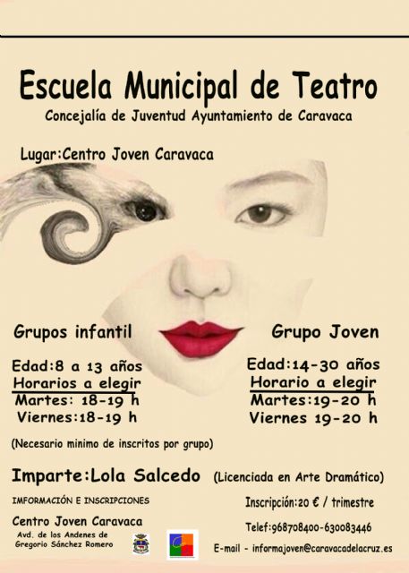 La Concejalía de Juventud del Ayuntamiento de Caravaca de la Cruz abre el plazo de matrícula en la 'Escuela Municipal de Teatro', que se impartirá en diversos horarios, los martes y viernes por la tarde, con diferentes grupos infantiles y juveniles, en función de la edad del alumnado.