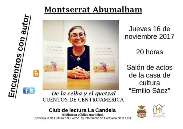 La Concejalía de Cultura del Ayuntamiento de Caravaca de la Cruz, a través de la Biblioteca Municipal y en colaboración con el Club de Lectura 'La Candela', continúa este jueves, 16 de noviembre, a las 20.00 horas, con los 'Encuentros con autor'. En esta ocasión, estará protagonizado por la escritora Montserrat Abumalham, que presentará su libro de cuentos 'De la Ceiba y el Quetzal', en el salón de actos de la Casa de la Cultura 'Emilio Sáez'.