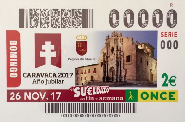 Caravaca de la Cruz protagoniza el cupón de la ONCE este domingo, 26 de noviembre. A través de cinco millones y medio de cupones, distribuidos en dos mil puntos de venta, se está difundiendo por toda España la imagen la Santísima y Vera Cruz y de la fachada de la Basílica, coincidiendo con la celebración del Año Jubilar 2017.