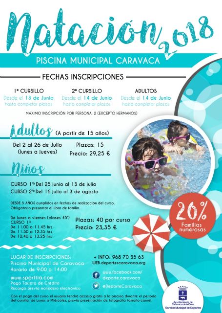 Las inscripciones se realizarán en la piscina municipal, de 9.00 a 14.00 horas, o a través de la web www.sporttia.com, con un máximo de dos matrículas por persona (excepto hermanos). Aquellas personas interesadas en recibir más información pueden contactar con la Concejalía de Deportes, a través del número de teléfono 968 70 35 63 o visitando la web www.deportescaravaca.org.