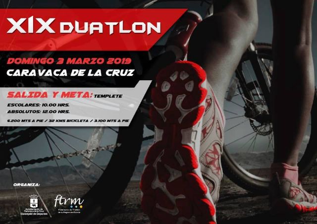 Un total de 400 deportistas se dan cita este domingo, 3 de marzo, en la XIX edición del 'Duatlón Caravaca de la Cruz', que organiza la Concejalía de Deportes del Consistorio caravaqueño, con la colaboración de la Federación de Triatlón de la Región de Murcia (FTRM), siendo una de las pruebas puntuables para la Liga Regional de Duatlón 2019.