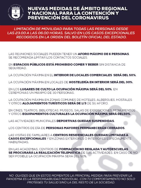 Los boletines oficiales del Estado y de la Región de Murcia han publicado normativa de obligado cumplimiento y recomendaciones para la contención del COVID-19. Tienen un carácter provisional inicial de quince días en función de la evolución de la pandemia. Entre ellas, destaca, con el decreto de Estado de Alarma, la limitación de libertad de movimiento de 23.00 a 06.00 horas.