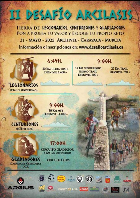 La pedanía caravaqueña de Archivel ya prepara la segunda edición del multievento deportivo ‘Desafío Archilasis’, donde los participantes ponen a prueba su fuerza, resistencia y destreza, a través de tres modalidades de participación diferenciadas: ‘Legionarios’, con distancias a pie de 15, 27 y 50 kilómetros; ‘Centuriones’, con una distancia de 50 kilómetros en bicicleta, y ‘Gladiadores’, circuito de 5 kilómetros y 20 obstáculos.
