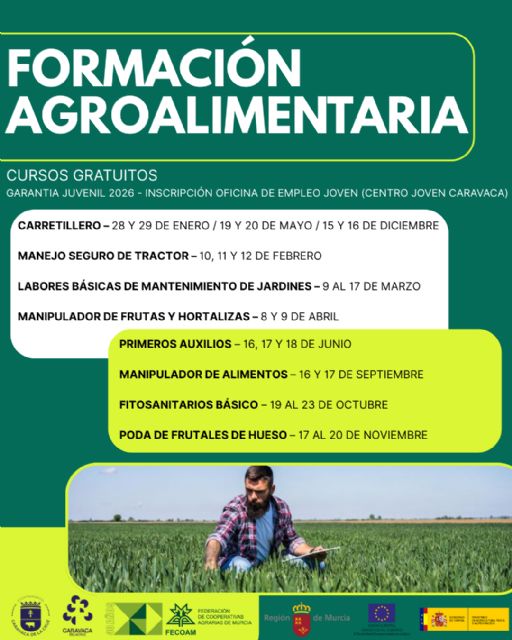 El Ayuntamiento de Caravaca de la Cruz, a través de la Oficina de Empleo de la Concejalía de Juventud, pone en marcha una nueva programación de cursos formativos de la rama agroalimentaria con el objetivo de mejorar la empleabilidad de los jóvenes y favorecer su incorporación al mercado laboral. Esta iniciativa se enmarca en el convenio de colaboración que desde hace varios años mantienen el consistorio caravaqueño y la Federación de Cooperativas Agrarias de la Región de Murcia (FECOAM).
