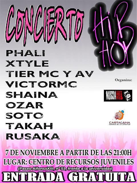 El Centro de Recursos Juveniles acoge mañana viernes, 7 de noviembre, un concierto de hip hop organizado por el Programa T-La (Tiempo Libre Alternativo), en su apartado 'Quedamos esta noche', con la colaboración de la Asociación Juvenil Música Viva.