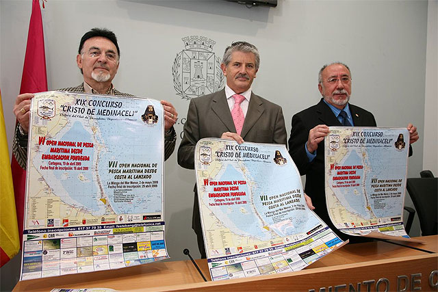 El concejal de Deportes, Alonso Gómez, junto al presidente del Club de Pescadores Deportivos Albacora, Nicolás Segado; y el presidente de honor Pedro Ñíguez Soriano, han presentado hoy el XIX Concurso de pesca Cristo de Medinacelli, con el VI Open Nacional de Pesca Marítima desde embarcación fondeada, que se celebra el próximo 19 de abril, y el VII Open Nacional de Pesca Marítima desde costa al lanzado, que tendrá lugar los días 2 y 3 de mayo.