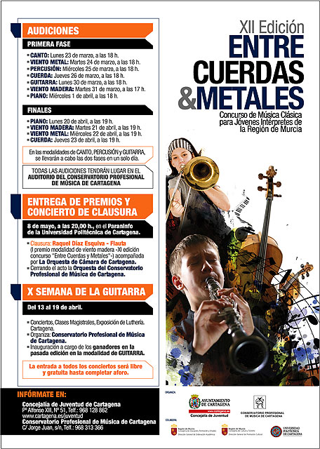 Los conciertos pertenecientes a las finales del concurso tendrán lugar en el Auditorio del Conservatorio Profesional de Música de Cartagena, a partir de las 19 horas, y con entrada libre y gratuita hasta completar aforo.
