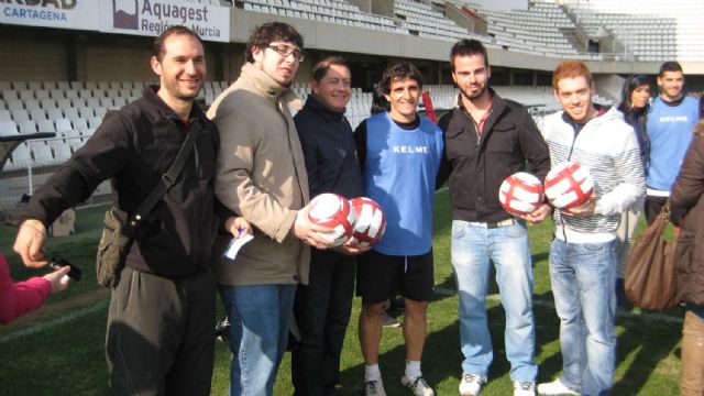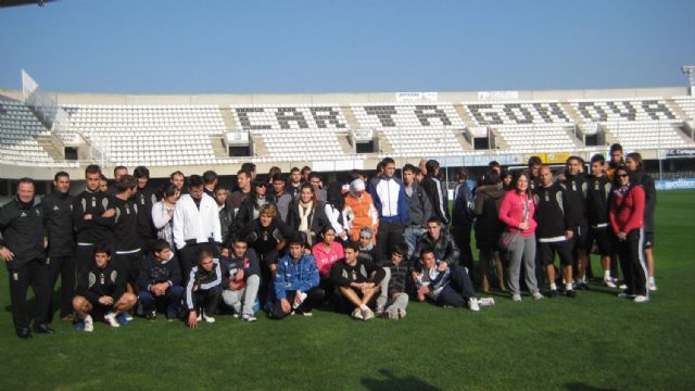 Alumnos y profesores de las aulas ocupacionales de los institutos Mediterráneo y Santa Lucía han participado esta mañana en una jornada especial del programa ADE (Acercamiento al Deporte de Élite) visitando el estadio municipal Cartagonova donde han conocido el trabajo que desarrollan los jugadores y cuerpo técnico del F.C. Cartagena.