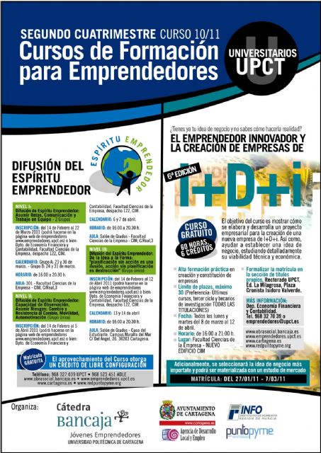 En la web www.emprendedores.upct.es se puede acceder a toda la información, así como a la forma de matrícula. Para hacer la inscripción se puede enviar un correo electrónico a: emprendedores@upct.es e indicar nombre y apellidos y curso de interés, o pasar por el Departamento de Economía Financiera y Contabilidad.