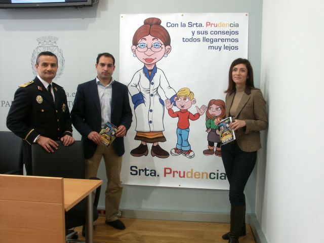 El Concejal de Seguridad Ciudadana, Javier Herrero, acompañado por el Inspector de la Policía Local, Manuel Asensio, han presentado hoy la nueva revista sobre educación vial La Srta. Prudencia, acompañados por la directora de la publicación, María del Carmen Casa.