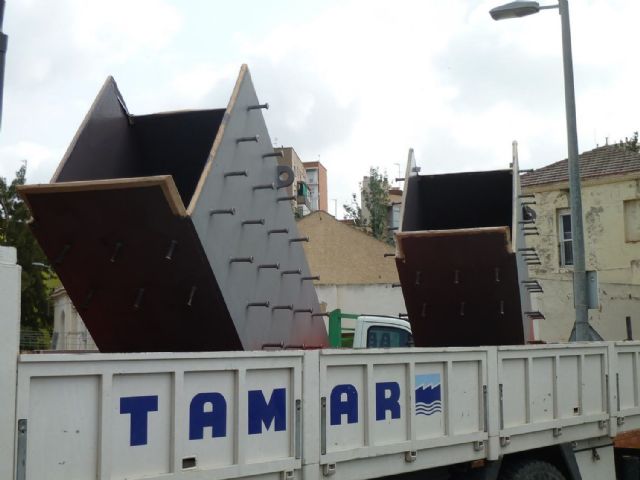Las piezas corresponden a dos de los tres tramos de la pasarela peatonal que unirá las dos márgenes de la Rambla. Los operarios de la empresa contratista trabajarán a partir de hoy y durante unos días para ensamblar las piezas y soldarlas, a fin de poder colocarlas, apoyadas en ambos márgenes, en torno al martes o miércoles de la semana próxima, cuando se transportarán otras piezas de la pasarela.