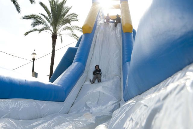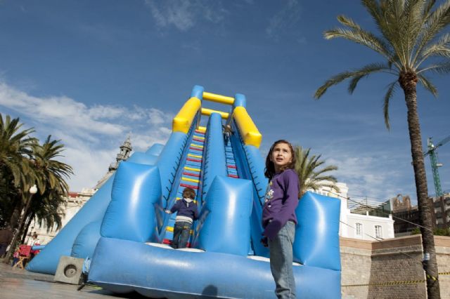 Niños tirándose por los toboganes gigantes que se han colocado en Héroes de Cavite u otros que prefieren participar en los talleres de dibujo son algunas de las imágenes que a todas horas puede ver quien pasea por el centro.