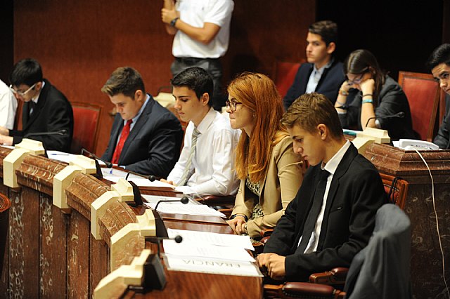 El hemiciclo de la Asamblea Regional de Murcia ha acogido esta mañana a unos “parlamentarios” muy especiales, estudiantes de primero de Bachillerato del colegio Santa María de la Paz (Jesuitinas) de Murcia, que durante toda la mañana han debatido sobre temas tan complejos como las lenguas europeas en peligro de extinción, la reindustrialización de Europa, el acuerdo Unión Europea-China y el impacto de las políticas de austeridad.