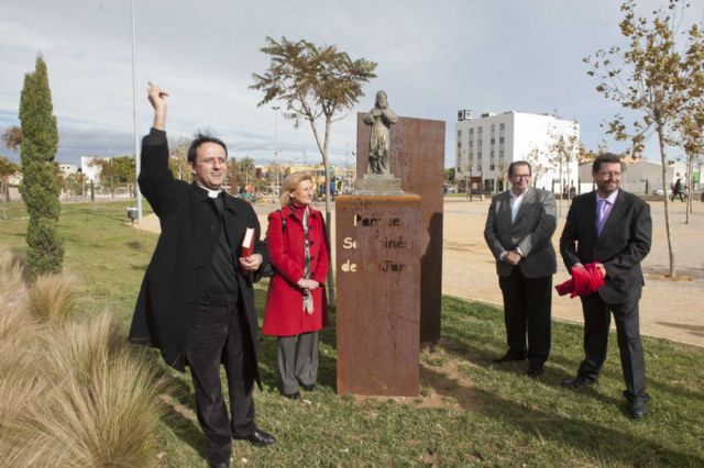 Hace un año de la apertura al público de esta zona verde junto a esta barriada cartagenera. Ahora su santo ya la custodia tras el acto de inauguración en el que se colocó la efigie, sobre un pedestal de acero.