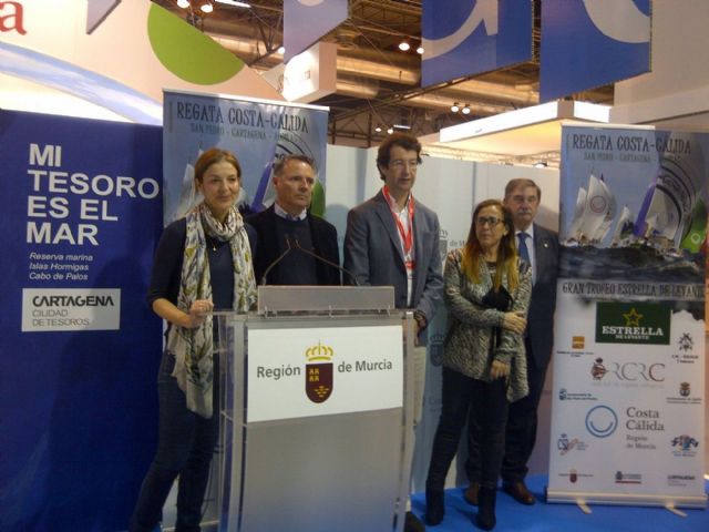 La I Regata Costa Cálida, Gran Trofeo Estrella de Levante para Cruceros, ha tenido esta mañana su presentación oficial en la Feria Internacional de Turismo (FITUR), de Madrid. El acto promocional ha contado con la presencia de Juan Carlos Ruiz, consejero de Industria y Turismo de la Región de Murcia; los concejales de Turismo de Cartagena, Ãguilas y San Pedro del Pinatar: Carolina Palazón, Clara Valverde y Antonio Martínez; así como el responsable de Comunicación y Relaciones Externas de Estrella de Levante, Juan Miguel López, y el director técnico del Real Club de Regatas de Cartagena, Eduardo Gallego..