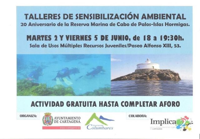El Ayuntamiento de Cartagena y la Asociación Columbares, en colaboración con el Programa Implica2, han organizado unos talleres de sensibilización ambiental. Se realizarán el martes 2 y el viernes 5 de junio, de 18.00 a 19.30 horas, en la sala de Usos Múltiples del Centro de Recursos Juveniles. La entrada es gratuita hasta completar aforo.