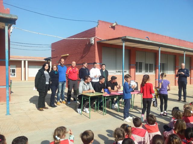 Esta mañana, el concejal de Deportes, Ricardo Segado, ha visitado el C.E.I.P Virgen de Begoña con los jugadores del F.C. Cartagena, Gonzalo Verdú, Mario Sánchez y Manzanares, para entregar las 300 entradas escolares previstas para el partido que se celebrará el próximo domingo, en el Estadio Cartagonova frente al Lorca.