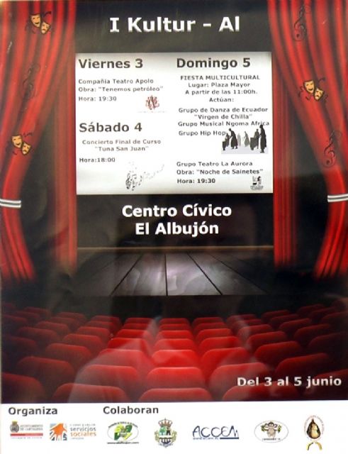 El Albujón recupera tras diez años su certamen cultural, denominado Kultur -Al, que tendrá lugar los días 3, 4 y 5 de juniocon el objetivo de que colectivos de distintos países y diferentes culturas participen de manera conjunta.