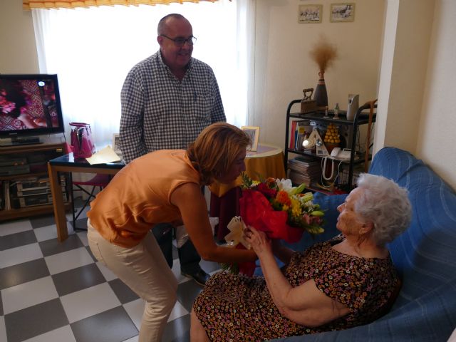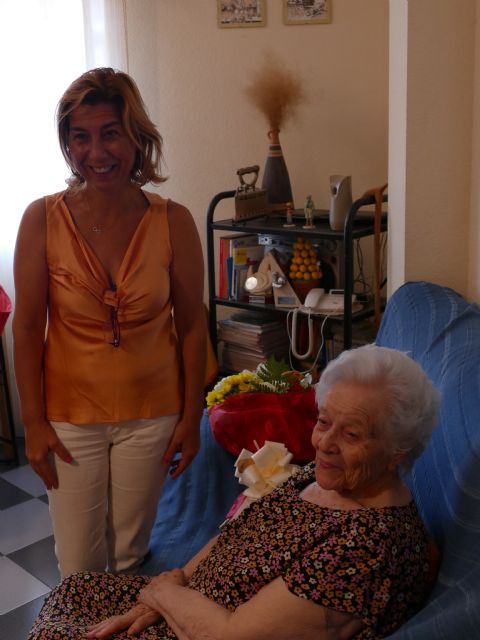 Cien años dan para mucho, para atesorar experiencias, sabiduría y vivencias, todo esto es lo que Inocencia Cabezas acumula a sus espaldas y la Concejalía de Servicios Sociales ha querido reconocer el mérito de esta abuela que en diciembre se convertirá en centenaria. La concejala Carmen Martín, se ha desplazado hasta su domicilio situado El Plan, para hacerle llegar el reconocimiento del Consistorio de Cartagena. La edil, acompañada por el técnico de Servicios Sociales, Damián Olmos, le ha entregado a Inocencia un ramo de flores y una placa conmemorativa.