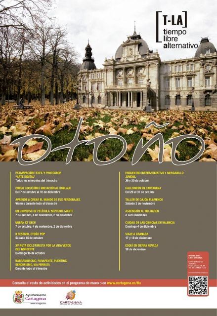 Excursiones, viajes, talleres y cursos son algunas de las 95 propuestas que la Concejalía de Juventud del Ayuntamiento de Cartagena pone a disposición de los jóvenes gracias al TLA de Otoño. El Tiempo Libre Alternativo para esta estación ofrece numerosas actividades orientadas a todos los gustos; desde un festival pop otoñal al protagonismo de la cultura urbana o una muestra de cortometrajes, sin olvidar actividades de terror con motivo de la festividad de Halloween.