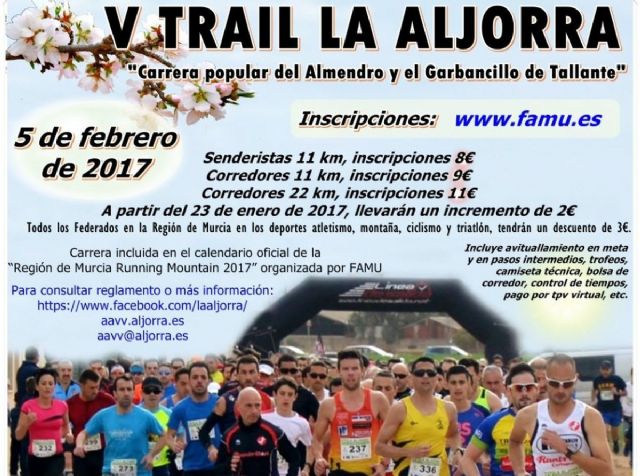 La quinta edición de la Trail de La Aljorra 'Carrera Popular del Almentro y el Garbancillo de Tallante' llega el próximo domingo, 5 de febrero, para la cual está ya abierto el plazo de inscripciones, y que se incluye en el calendario oficial de la 'Región de Murcia Running Mountain 2017' de la Federación de Atletismo.