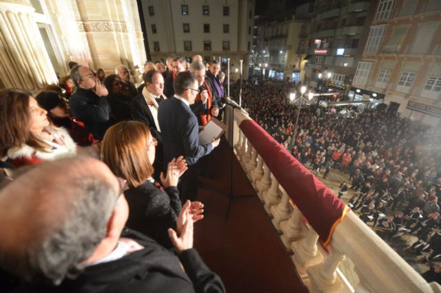 Ya en el balcón tomará la palabra el presidente de la Junta de Cofradías, que este año es el hermano mayor del Socorro, Manuel Martínez Guillén. Contestará el alcalde dando conformidad a la celebración de las procesiones y entregará el cheque, que constituye la ayuda directa en metálico que destina el consistorio a las cofradías.