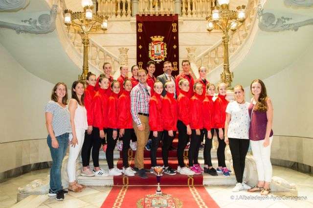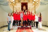 El alcalde de Cartagena, José López, y el concejal de Deportes, Ricardo Segado, han recibido este mediodía a las integrantes del equipo de Gimnasia Estética de Grupo del Club Rítmica Cartagena, para felicitarles por su excelente papel en el mundial de esta disciplina que se celebró en Helsinki (Finlandia) entre los días 26 y 28 de mayo.