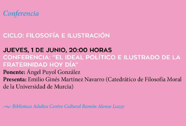Organizado por la Concejalía de Cultura del Ayuntamiento de Cartagena, a través de Cartagena Piensa y Leer, Pensar e Imaginar, el jueves día 1 de junio tendrá lugar en la Biblioteca Josefina Soria del Centro Cultural Ramón Alonso Luzzy la conferencia titulada “El ideal político e ilustrado de la fraternidad hoy día", a cargo del